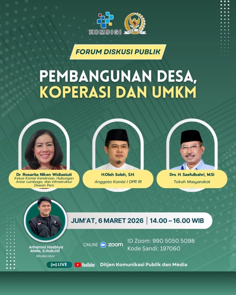 Jakarta – Upaya memperkuat pembangunan desa serta pemberdayaan koperasi dan UMKM menjadi salah satu fokus pemerintah dalam mendorong pemerataan ekonomi nasional. Hal tersebut dibahas dalam webinar Forum Diskusi Publik bertema “Pembangunan Desa, Koperasi dan UMKM” yang diselenggarakan Badan Pengembangan Sumber Daya Manusia Komunikasi dan Digital pada Jumat (6/3/2026). Kegiatan tersebut menghadirkan sejumlah narasumber, di antaranya […]